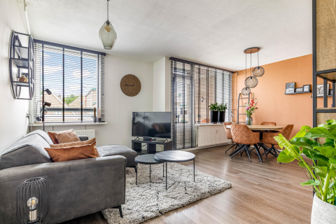 De lichte en royale woonkamer is een fijne plek om te verblijven. Grote raampartijen aan de achterzijde zorgen voor een prettige hoeveelheid daglicht en geven direct toegang tot de achtertuin via een deur, waar u kunt genieten van veel groen en rust. De nette parketvloer loopt door tot in de hal en zorgt voor een warme, verzorgde uitstraling.